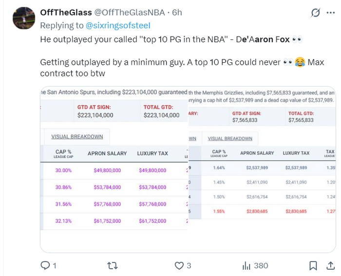 美媒:福克斯根本没有资格进入联盟前十控球后卫之列了,他被一个身材矮小的PG打得毫无还手之力,一个联盟前十的控卫不可能被压制成这样,福克斯这份顶薪合同太离谱了。